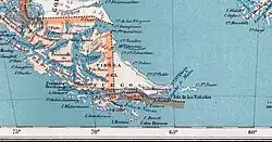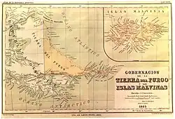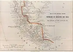 Partial reproduction of the first Argentine map showing the boundaries laid down in the Boundary Treaty of 23 July 1881, appeared in "La Ilustracion Argentina" issue of 10 November 1881 in Buenos Aires. The copy reproduced here is one handed to the British Minister Plenipontentiary in Buenos Aires by Dr. Bernardo de Irigoyen, Argentine Minister of Foreign Affairs who negotiated and signed the Boundary Treaty. The original is located in the official British Archives. The British Minister sent it to his Government with the comment that the dark shaded area "comprising the Strait of Magellan, half of Tierra del Fuego and all the southern islands, represent was actually has been ceded to Chile by the recent Treaty."[1]: §122 (under Irigoyen map)