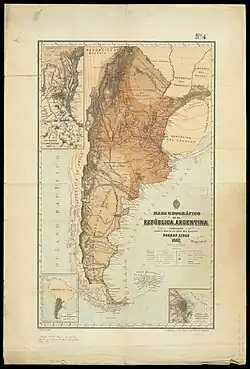 This map, reproduced here, is included in the book Geography of the Argentine Republic (Geografía de la República Argentina) published in Buenos Aires in 1888, editorial Lajouane, by Francisco Latzina, National Director of the Argentine Statistics Institute and member of numerous scientific societies. "This work obtained the 'Rivadavia Award' [Gran Premio Bernardino Rivadavia] of the 'Argentine Geographic Institute' and a large number of copies of it were ordered by the Argentine authorities for distribution in Europe and elsewhere."[1]: §157a The jury was conformed by Estanislao Zeballos, Bartolomé Mitre, Julio Argentino Roca, Domingo Faustino Sarmiento, Guillermo Rawson and Lucio V. Mansilla.[2]