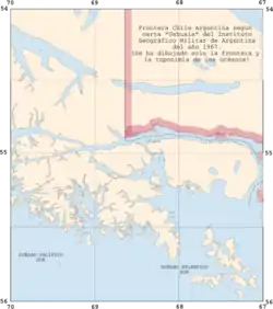 - ^ Andrea Wagner: Der argentinisch-chilenische Konflikt um den Beagle-Kanal. Ein Beitrag zu den Methoden friedlicher Streiterledigung. Verlag Peter Lang, Frankfurt a.M. 1992, ISBN 3-631-43590-8, German Language, p. 106 :«Resumé:Es existierten verschiedene argentinische Karten, die die Rechtauffassung Chiles widerspiegelten, v.a. in der Zeit unmittelbar nach dem Abschluß des Grenzvertrages von 1881. Das chilenische Kartenmaterial war dagegen stets einheitlich geblieben, und hat nur die chilenische Auffassung wiedergegeben.»
