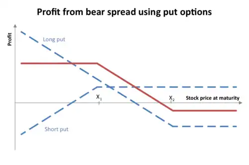Because of put–call parity, a bear spread can be constructed using either put options or call options. If constructed using calls, it is a bear call spread (alternatively call credit spread). If constructed using puts, it is a bear put spread (alternatively put debit spread).