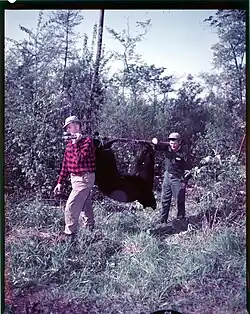 Hunters in Ontario transporting a dead black bear using a carrying pole. Bearskin caps used by several military units are sourced from bears hunted in Canada, a practice opposed by PETA.