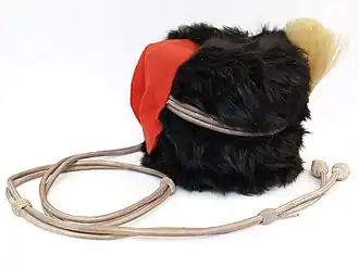 A busby worn by a British artillery unit from the 19th century. The headgear is an example of a furred cap similar in appearance to the bearskin.