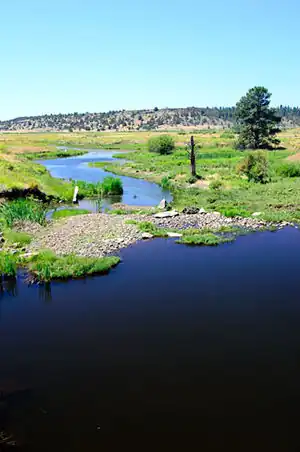 Named tributaries of the creek from source to mouth are Sugar Creek, which enters from the right; Grindstone Creek, left; Wolf and Paulina creeks, right; Alkali Creek, left; Profanity Gulch, right, and Drift Canyon, left.[3] Oregon Route 380 (Paulina Highway) runs along the lower creek from near Paulina to the mouth. The stream flows under the highway twice, first slightly upstream of Paulina and then further downstream near Profanity Gulch.[3]