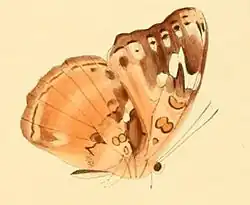 The wings in the male red-yellow above, little marked with black; the cell of the forewing with a black ring in the middle and a hollow transverse marking at the end; beyond the cell three black transverse lines begin at the costal margin, of which the first only extends to vein 4, the second is continued by some indistinct free spots in cellules 4—2 and the third reaches vein 1, but is broken up into spots; at the distal margin a black marginal band 2 mm. in breadth; the upperside of the hindwing is broadly black-grey at the costal margin and has in addition a dark marginal band only 1mm. in breadth, an even narrower submarginal band broken up into streaks and some dark transverse markings in the cell; the underside of the forewing is dark violet-brown with two large spots in the cell, a spot at the costal margin beyond the apex of the cell and the apex of the wing white or whitish; on the hindwing the basal area and a broad costal stripe are black-brown, the basal area, however, with a whitish band between vein la and the anterior margin of the cell, the distal half is violet-grey and has beyond the middle some dark spots, basally bounded by whitish streaks. The female is orange above and has the apical part of the forewing as far as the cell black with a short, dentate white oblique band between the middle of the costal margin and vein 4 and white submarginal spots in cellules 3—9; the hindwing only with dark marginal band and submarginal line; the under surface as in the male only somewhat lighter. Old Calabar to Ogowe.[3]