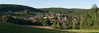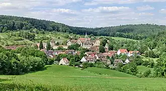 Bebenhausen (German pronunciation: [ˌbeːbn̩ˈhaʊzn̩] ⓘ) is a village (pop. 347) in the Tübingen district, Baden-Württemberg, Germany.[1] Since 1974 it is a district of the city of Tübingen, its least populous one. It is located 3 km north of Tübingen proper (about 5 km northeast of the city centre), in the southeastern part of the protected landscape of the Schönbuch, a dense forest. Bebenhausen is famous for its monastery, Bebenhausen Abbey, founded in 1183 by Count Palatine Rudolph of Tübingen.