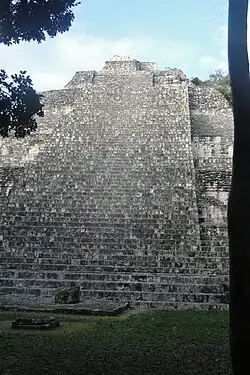 Becan (Spanish: Becán) is an archaeological site of the Maya civilization in pre-Columbian Mesoamerica. Becan is located near the center of the Yucatán Peninsula, in the present-day Mexican state of Campeche, about 150 km (93.2 mi) north of Tikal. The Maya sites of Balamku, Calakmul, Chicanna and Xpuhil are nearby. The name Becan was bestowed on the site by archaeologists who rediscovered the site, meaning "ravine or canyon formed by water" in Yukatek Maya, after the site's most prominent and unusual feature, its surrounding ditch.