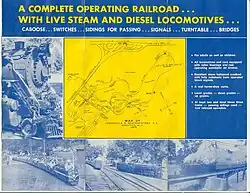 At full operation, the railroad ran on Saturdays until 5 pm between the beginning of May and the end of October, including Memorial Day, the Fourth of July, and Labor Day. It also operated on Wednesdays during July and August until dusk. It provided a two-mile (3 km) round-trip ride between Centerville and Peachtree Jct. Originally, a round-trip ticket cost 20 cents for children and 40 cents for adults (later raised to 24 and 48 cents, respectively, during the early 1960s, and to 25 and 50 cents, respectively, by the late 1960s).[1] Typically, #1501, a 4-8-4 live steam locomotive, would pull a train on the hour (10 am, 11 am, noon, etc.) and #1502 or #1503 (miniature diesel locomotives) would run on the half-hour (10:30 am, 11:30 am, etc.). Six to eight passengers could ride per car, and trains usually ran with 8-10 cars. On rare occasions, if ridership warranted, #1500 (a smaller 0-4-0 diesel engine) would be called to run as an "extra" with a shorter consist of cars (usually no more than four cars) on the quarter-hour.
