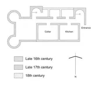 The second phase of building at Bedlay took place in the late 17th century, with a large extension added to the west. This extension is of the same height as the original building, with a single room on each floor. Round towers finish off both western corners of the extension. Because the extension was built on lower ground, an extra floor was created at the lower level, accessed from the ground floor, and including a hidden room beneath one of the towers.