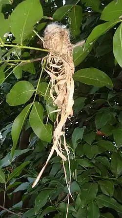 Using strands of cobwebs, bark, and lichen, female bee hummingbirds build a cup-shaped nest about 2.5 cm (1 in) in diameter and 3–5 m (9.8–16.4 ft) off the ground. The nest is lined with a layer of soft plant wool.[17] Branches in mature, leafy jucaro (Terminalia buceras) and juvenile ocuje (Calophyllum antillanum) trees are commonly used for nest building. After completion of the nest, the eggs are incubated for 21 days by only the female, followed by 2 days of hatching, and 18 days of care by the mother. During days of care the mother will hunt for small insects while chicks are left alone in the nest. Over the final 4–5 days of care, juvenile bee hummingbirds practice their flight capabilities. The nests are used only once.[16]