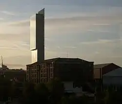 Ground and foundation works commenced at the beginning of 2004, and construction started in April 2004.[29] By August 2004, work on its twin concrete cores had started and the structure was rising at a steady rate. One of the cores reached 122 m (400 ft) at the end of July 2005, at which point the building became the tallest skyscraper in the United Kingdom outside London.[23] The tower was "topped out" on 26 April 2006.[30] Local wind conditions dictated its height had to be reduced by about 2 m (6 ft 7 in) from the planned 171 m (561 ft).[3] The hotel opened on 9 October 2006, and the first apartment residents moved in during 2007. The skyscraper cost £150 million to construct.[4] In 2010, Braemar Estates, part of Braemar Group, were awarded a contract for management of the building.[31] In 2018, Braemar Estates rebranded as Rendall & Rittner, taking the name of the managing agent which bought it out the year before.[32]