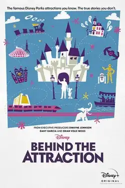 Behind the Attraction is a documentary television series on Disney+ produced by Dwayne Johnson's Seven Bucks Productions and Brian Volk-Weiss's The Nacelle Company.[2] The first five episodes were released on July 21, 2021, with the remaining five released on August 25, 2021.[3] The documentary is narrated by Paget Brewster.[4][5] The series features interviews with fans and Imagineers and analyzes the history, popularity[6] and transformation of Disney attractions and destinations over time.