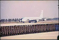 One of its first major state visits that the battalion was tasked with its presence was the Richard Nixon's 1972 visit to China, which set the precedent for PLA protocol on state visits. The battalion was given the responsibility in May 1977 to raise the national flag on Tiananmen Square. This was among its list of duties until December 1982.[5] In September 1983, it was renamed to the Honor Guard of the 1st Guard Division of the People's Liberation Army. In January 1986, with the approval of the Beijing Military Region headquarters, the unit was renamed for the final time to its current name. On 2 March 1992, Jiang Zemin, Chairman of the Central Military Commission, signed an order to award the honorary title of the "Jiangsu Model of the Yilong Brigade" to the battalion.[6] In December 2017, the BGHGB officially attached the Beijing Garrison Color Guard Company as part of the battalion, formerly under the People's Armed Police, which had been responsible for flag raising ceremonies for 35 years.[5]