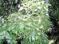 The shoots and stems are hairy. The elliptic shaped leaves are alternate and not toothed, 8 to 10 cm long and 2 to 3 cm wide. Leaf venation is prominent on both sides, with a raised midrib and prominent intramarginal vein.