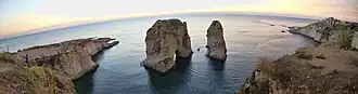 Beirut sits on a peninsula extending westward into the Mediterranean Sea.[90] It is flanked by the Lebanon Mountains and has taken on a triangular shape, largely influenced by its situation between and atop two hills: Al-Ashrafieh and Al-Musaytibah. The Beirut Governorate occupies 18 square kilometres (6.9 sq mi), and the city's metropolitan area 67 square kilometres (26 sq mi).[90] The coast is rather diverse, with rocky beaches, sandy shores and cliffs situated beside one another.
