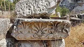 The foundation of the mausoleum was a square outcrop of natural rock;[18] each side measuring some 29.65 m, suggesting a length of 100 feet of 0.2965 m.[19] The mausoleum was two stories. On the ground level there were three steps supporting the base mouldings. Each plain socle was surmounted by torus, cavetto and Lesbian cyma. Ten courses of large neatly cut ashlars, 69–88 cm high, which constituted the facing of the podium, made for a total height of 11.37 m.[19] A low architrave, 45 cm high, and a higher Doric frieze of triglyphs and metopes[20] ran around the top of the podium. The south side had a deep recess that was cut into the rock core for the burial chamber, which was placed in the center and sealed from outside. This was done in order to conceal what was in the monument and to protect the monument from tomb raiders. The chamber which Antiochus II was buried in was a small vestibule with a rectangular back room for his body to be put in a barrel-vault. There was an unfinished false door on the north side of the structure. The top story had 3 steps measuring 1.12 m high. The top slope served as a stylobate for a Corinthian Peristalsis, with eight columns on each side. The roof had flat marble tiles.