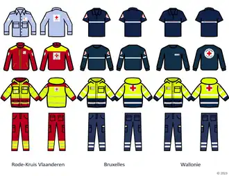 Standard uniforms of the Belgian Red Cross for the three regions of Belgium.