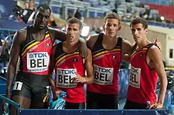 | Antoine Gillet Jonathan Borlée Dylan Borlée Kevin Borlée Arnaud Destatte Will Oyowe | 4 × 400 metres relay | 3:00.81 SB | 5 q | 3:01.02 | 5 | ||||