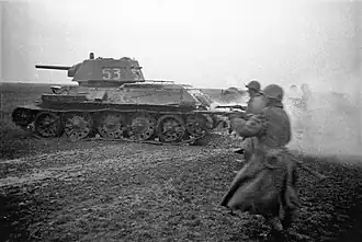 The Belgrade offensive or the Belgrade strategic offensive operation (Serbo-Croatian: Beogradska operacija / Београдска операција; Russian: Белградская стратегическая наступательная операция, Belgradskaya strategicheskaya nastupatel'naya operatsiya) (15 September – 24 November 1944)[9] was a military operation during World War II in Yugoslavia in which Belgrade was liberated from the German Wehrmacht through the joint efforts of the Soviet Red Army, Yugoslav Partisans, and the Bulgarian Army.[10] Soviet forces and local militias launched separate but loosely cooperative operations that undermined German control of Belgrade and ultimately forced a retreat.[11] Martial planning was coordinated evenly among command leaders, and the operation was largely enabled through tactical cooperation between Josip Broz Tito and Joseph Stalin that began in September 1944.[12][13] These martial provisions allowed Bulgarian forces to engage in operations throughout Yugoslav territory, which furthered tactical success while increasing diplomatic friction.[14]
