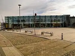 The Wigan Life Centre on the square is a hub for education, the arts, and leisure, as well as the site of civic offices.[6][7][8] The Life Centre adjoins Wigan Metropolitan Borough Council, on the site of the former Wigan International Pool.[8][9] Opened in 2011, as a consolidate public services hub.[10] The Life Centre consists of two main buildings: the North and South sites.[10] The North site houses a library and neighbourhood support facilities, the South site's "Healthy Living Zone", focuses on leisure and health services, including a 50-metre (160 ft) swimming pool,[11] a gym, and fitness studios.[10][12]
