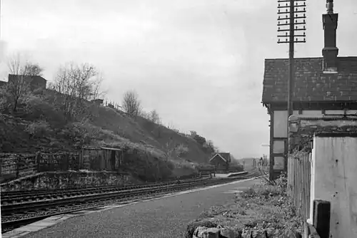 The station also had another somewhat unusual claim to fame, in that it was used as a shooting location for the 1951 feature film Another Man's Poison.[5] The film's main star, noted American actress Bette Davis, was apparently so impressed by it (according to reports in the local press) that she enquired if the station was for sale. It is not known whether her interest was genuine or not, but no formal purchase offer was made. It remained in use until 1959, when it was closed by the British Transport Commission. Although more than 100 local objections were lodged to the proposed closure, the local Transport Users' Committee accepted the British Railways arguments that the station was unviable and it was duly closed to passengers on 4 May 1959.[6]
