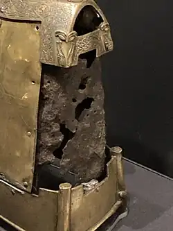The bell was enshrined in the 12th and 13th centuries with copper alloy sheet coverings.[14] The shrine's base and crest were cast as single pieces. The base is rectangular and made from copper alloy. Although relatively complex in design, it is undecorated. Each corner contains a rounded moulding placed above the object's four "feet". Two of the feet are damaged to the extent that the shrine cannot stand alone without additional support.[15]