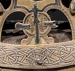 The semi-circular, arched crest is shaped to imitate a bell handle. It contains red and yellow enamel settings, and interlace patterns achieved through champlevé, inlaid copper and silver wires placed on bands of niello. The patterns bear obvious influence from the Ringerike style, reflecting the impact of Viking art on 12th and 13th-century Irish art.[5] The enamel settings were produced separately and are attached by rivets.[18] There were originally five on the top of the crest, today only three survive.[5] They are similar in style to those on the c. 1123 Cross of Cong, which were also produced independently and later attached.[18][19] The archaeologist Cormac Bourke speculates that given the similarities and contemporary dating, the shrine's now lost cross would have resembled that from Cong.[12]