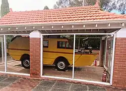 After the conclusion of the trip, Half-Safe remained in the United States, where it was occasionally exhibited by Carlin's friend George Calimer, who was a co-owner of the vehicle. Carlin remained in the country for a period, appearing on the lecture circuit, before returning to Perth, where he took up residence in Cottesloe. Having divorced his second wife Elinore by December 1955, Carlin wed for a third time on 1 June 1963 in the United States, marrying Cynthia Henderson. Although the couple's marriage was short-lived, the union produced one daughter, Deirdre Scott Carlin, who was born in March 1964.[1] Carlin died in Perth in March 1981, of a heart attack, and was cremated at Karrakatta Cemetery.[1] His second wife, Elinore, who completed the first half of his journey alongside him, died in 1996 in New York City.[8] Carlin left his share in Half-Safe to his old school, Guildford Grammar, as well as a sizeable endowment for the purposes of funding a scholarship. He had previously offered the craft to the Western Australian Maritime Museum, which declined the offer due to a lack of exhibition space.[59] The Guildford Grammar School Foundation subsequently purchased the other share in the vehicle, transferring it to the school's campus in Guildford, Western Australia. The school also posthumously published The Other Half of Half-Safe, which detailed the second portion of Carlin's journey.[60] In 1999, the craft was transported by truck across Australia to Corowa, New South Wales, where it featured in an annual celebration on the Murray River, along with 16 other amphibious vehicles from the Second World War.[8] Half-Safe is currently exhibited in a specially-made glass enclosure at Guildford Grammar's main campus.[13] Money from Carlin's estate was used to found the Charlotte Carlin Scholarship (named for his mother), awarded for "the proficiency of the English language with the avoidance of clichés".[60] Guinness World Records recognises Carlin as having completed the "first and only circumnavigation by an amphibious vehicle".[61]
