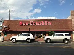 Ben Franklin is a chain of five and dime and arts and crafts stores found primarily in small towns throughout the United States, last owned by Promotions Unlimited of Mount Pleasant, Wisconsin.[1] They are organized using a franchise system, with individual stores owned by independent proprietors. It was perhaps the first retail franchise, starting in 1927.[2] They are named after Benjamin Franklin, taking a cue in their merchandise offerings from Franklin's saying, "A penny saved is a penny earned." Although Promotions Unlimited filed for bankruptcy in 2017, a number of stores continue to operate under the Ben Franklin name.
