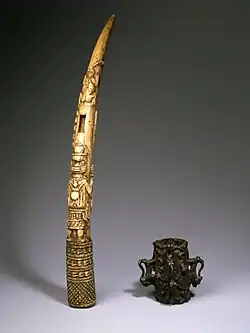 Akohen are large, side-blown trumpets carved of ivory and played by the Oba's retainers when he appears in full ceremonial dress at palace rituals.[5] The akohen glorify the Oba musically with their deep, piercing sounds, and visually, their white ivory signifying the Oba's wealth, strength and purity.[2]
