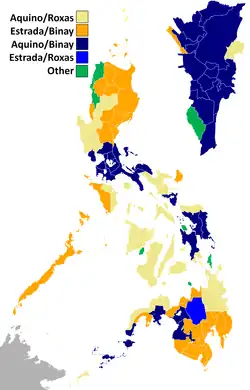 Winning presidential and vice presidential candidates per province/city in the elections. Note that the two positions are voted separately and voters can split their votes.