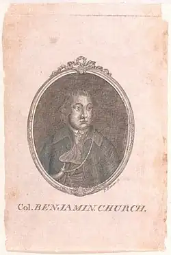 Colonel Benjamin Church (c. 1639 – January 17, 1718) was a New England military officer and politician who is best known for his role in innovative military tactics notably developing unconventional warfare.[1] He is also known for commanding the first ranger units in North America. Born in the Plymouth Colony, Church was commissioned by Governor Josiah Winslow to establish a company of Rangers called after the outbreak of King Philip's War. Church participated in numerous conflicts which involved the New England Colonies. The force of New Englanders he led tracked down and killed Wampanoag sachem Metacomet, a major factor in ending the conflict.[2][3]