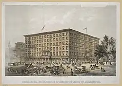 The first hotel on the site was the Continental Hotel, built from 1857 to 1860.[4] The 700-room, six-story hotel was designed in the Italianate style by architect John McArthur Jr., who also designed the Philadelphia City Hall.[5] The luxurious hotel boasted one of the first elevators in the country, and a grand stairway made from polished Italian marble. Its main entrance was redesigned by noted Philadelphia architect Frank Furness in 1876.[5]