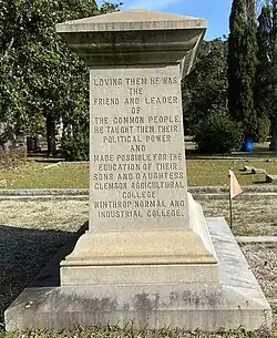 Tillman had met, in 1886, with Thomas G. Clemson, son-in-law of the late John C. Calhoun, to discuss a bequest to underwrite the cost of the new agricultural school. Clemson died in 1888, and his will not only left money and land for the college, but made Tillman one of seven trustees for life, who had the power to appoint their successors. Tillman stated that this provision, which made the lifetime trustees a majority of the board, was intended to forestall any attempt by a future Republican government to admit African Americans.[55] Clemson College (later Clemson University) was authorized by the legislature in December 1888.[56]