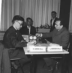 Larsen was born in Tilsted,[6] near Thisted in Denmark, and was educated at Aalborg Cathedral School. In January 1942, he contracted a number of childhood diseases. Although none had any permanent effects, it was during this period that he discovered chess.[1] Larsen went on to represent Denmark twice in the World Junior Championship, in 1951 at Birmingham (placing fifth) and in 1953 at Copenhagen (placing eighth). He began playing seriously at the age of 17 when he moved to Copenhagen to study civil engineering, but he never graduated, choosing instead to play chess professionally.[7] Furthermore, during his military service he studied Russian, which was instrumental in assisting him to understand Russian-language chess literature (something Bobby Fischer was also known to have done).[8][9][10][11] Larsen became an International Master at the age of 19 in 1954, from his bronze-medal performance on board one at the Amsterdam Olympiad.[12] He won his first of six Danish Championships in 1954, repeating this feat in 1955, 1956, 1959, 1963 and 1964.[13]