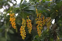 Berberis valdiviana is a species of flowering plant in the barberry family Berberidaceae. It is an evergreen shrub endemic to Chile, where it is locally known as clen or espina en cruz. It is distributed between the Santiago Metropolitan and Los Ríos regions.[2] The Latin specific name valdiviana refers to the Valdivia Province of Chile.[3] It has simple, dark green, pointed leaves, glossy on the upper surfaces, up to 8.5 cm (3.3 in) long. The flowers, which appear in May, are grouped in hanging racemes. Individual flowers are orange, 5–8 mm (0.2–0.3 in) across, and are followed by purplish fruits. It is grown as an ornamental plant, but is not suitable for colder regions.[4]