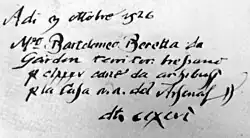 The Beretta forge was in operation from about 1500,[7] although the first documented transaction is a contract dated 3 October 1526, for 185 arquebus barrels, for which the Republic of Venice was to pay 296 ducats to Maestro di Canne (master gun-barrel maker) Bartolomeo Beretta (in Italian).[5] The original account document for the order of those barrels is now stored in the Archivio di Stato di Venezia (in Italian) in Venice.[8] By the end of the 17th century, Beretta had become the second largest gun barrel maker in Gardone.[6]