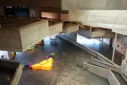The former Berkeley Art Museum building was designed by Mario Ciampi and associates Ronald E. Wagner and Richard Jurasch and opened in 1970.[6] The concrete Brutalist structure—one of the most inventive buildings in that style, with its fan-shaped procession down a spiral of semi-open galleries—was deemed seismically unsafe in 1997, and iron braces were added in 2001 to improve safety. In 1999, the Pacific Film Archive moved to a temporary building across the street.[34]
