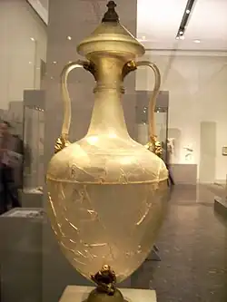 Since the technique of glassblowing had not yet been invented, its creation was a complicated process. The vase was made from two pieces: the widely flaring belly on a high foot, and the shoulder with a long neck and flaring mouth. These two pieces fit together exactly. The join is covered by a gilt copper strip decorated with vine patterns. Only one side of this strip survives, however. The two parts were made in turn. The belly, whose walls are very thin, was either cast in a mould or pressed onto a mould. The bell-shaped foot was produced similarly, which was then hot joined to the belly piece using a solid stick. The other portion was made in the same way. The shoulder and a portion of the neck were either cast in a mould or lowered onto a template while hot. The rest of the neck and the mouth were melted together with a hot stick, just as the foot and belly were. Because of the bulge, the join can easily be spotted.