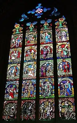 The Hostienmühle window was built between 1448 and 1453 and was funded by the city of Bern. The Three Kings window was built between 1447 and 1455 for Rudolf von Ringoltingen, possibly in Constance or the Oberrhein region. The Bible scenes window was originally supposed to be just of the young Christ but was changed after 1447. It was built between 1448 and 1451 and was funded by three members of the Gesellschaft zum Mittellöwen. The Passion window was built between 1438 and 1441. Only 21 panels of the original window remain.[18] It was built for the city through the Schultheiß by Hans Acker in Ulm. The Ten thousand martyrs window was originally supposed to be of the Resurrection of Jesus, but that was changed after 1447. It was built between 1447 and 1449 and was funded by donations from the citizens of Bern. It was built by Master Painter Bernhart and glazier Niklaus Magerfritz in Bern. The Ten thousand martyrs window was replaced in 1868 by the Christ window. The Stephanus window replaced an earlier window in 1868. The theme of the original window is unknown but it was built in 1449–1451 for Kaspar von Scharnachtal, probably by Niklaus Magerfritz in Bern. The Coat of Arms window was built in 1820–30 to replace an earlier, unknown window.[19]
