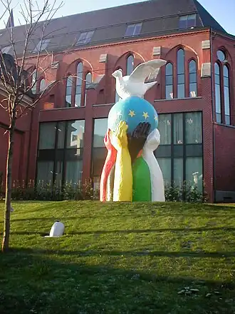 Another of his well-known works is the Statue of Europe, commissioned by Brussels and which holds centre place Jean Rey in the same town. The statue, named Unity in Peace, depicts various arms supporting the European symbol, topped by the dove of peace. It was designed to represent the ethnic diversity within Europe and as a message of brotherhood, tolerance and hope. Made out of resin, it measures more than five metres and weighs nearly 800 kg and was erected to celebrate the year of people with disabilities in 2003. It was manufactured, modelled, polished and painted by children of different cultures with impaired vision, under Romain's supervision.