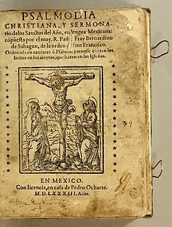 Sahagún was a gifted linguist, one of several Franciscans. As an Order, the Franciscans emphasized evangelization of the indigenous peoples in their own languages. Sahagún began his study of Nahuatl while traveling across the Atlantic, learning from indigenous nobles who were returning to the New World from Spain. Later he was recognized as one of the Spaniards most proficient in this language.[2] Most of his writings reflect his Catholic missionary interests, and were designed to help churchmen preach in Nahuatl, or translate the Bible into Nahuatl, or provide religious instruction to indigenous peoples. Among his works in Nahuatl was a translation of the Psalms and a catechism.[21] He likely composed his Psalmodia Christiana in Tepepolco when he was gathering material for the Primeros Memoriales. It was published in 1583 by Pedro Ocharte, but circulated in New Spain prior to that in order to replace with Christian texts the songs and poetry of the Nahuas.[22] His curiosity drew him to learn more about the worldview of the Aztecs, and his linguistic skills enabled him to do so. Thus, Sahagún had the motivation, skills and disposition to study the people and their culture. He conducted field research in the indigenous language of Nahuatl. In 1547, he collected and recorded huehuetlatolli (Nahuatl: "Words of the old men"), Aztec formal orations given by elders for moral instruction, education of youth, and cultural construction of meaning.[2] Between 1553 and 1555 he interviewed indigenous leaders in order to gain their perspective on the Spanish conquest of the Aztec Empire.[14] In 1585 he wrote a revision of the conquest narrative, published as Book 12 of the Florentine Codex, one of his last works before his death in 1590.