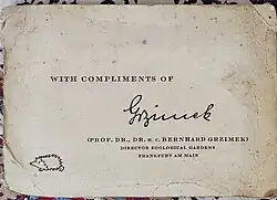 Grzimek was appointed director of the Frankfurt Zoological Garden on 1 May 1945 by Hollbach. The previous zoo director Georg Steinbacher was thought to have died but when he returned he was denied his former position. Steinbacher was dismissed from service on June 2, 1945 for having been a member of the Nazi party. In 1947 Steinbacher took up a position in Augsburg zoo with support from Munich Zoo director Heinz Heck but held a grudge against Grzimek.[1] With the zoo then in ruins and all but 20 animals killed, he prevented the permanent closure of the Frankfurt Zoo and the relocation of the "Center Zoo" to the outskirts. In June 1945 the rest of the family moves from Kenels to Frankfurt. The Zoo reopened on 1 July 1945, after all bomb craters had been filled and buildings temporarily restored. The posters declaring that the zoo had been opened were drawn by Martha Bertina who had illustrated earlier for the Illustrierte Blatt. There were no cinemas or other entertainment. So with festivals, film shows, dances and actors, Grzimek attracted the Frankfurt population, while receiving the assent of the Provisional Government and the U.S. military to continue the Zoo. Animals were acquired from all quarters including circus animals from Friedel Krone. Animal exchanges with Heck however ran into trouble as he felt cheated. The zoo attendance improved and 80000 visitors came in the first half of the year and 1.1 million in the second half. Walter Kolb became the mayor in August 1946 and he received a letter from Heck claiming that Grzimek had no qualification as a zoologist. Katharina Heinroth and others supported Grzimek and Kolb took no action. Oskar Hoppe wanted to have the circus inside the zoo and Grzimek opposed it. In November 1947 he was questioned by American authorities about his Nazi part membership. Around the same time many animals at the zoo died and were found to have been poisoned with sodium fluoride. In 1948 Kolb was forced to dismiss Grzimek on account of the information on his Nazi past.[1]