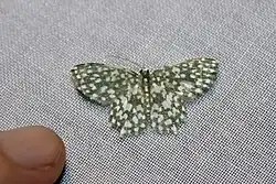 The wingspan is about 20–26 mm. Hindwings of male with the outer margin excised between veins 6 and 4. Veins 3 and 4 stalked. Hind tibia of the male dilated with a fold and tuft and two pairs on spurs. Hindwings of female excised. It is an olive-green moth with a rufous frons. Vertex of head whitish. Abdomen with white dorsal spots. Wings with many irregular white spots often conjoined into bands. Forewings with spots at base and end of cell. Antemedial, oblique medial, sinuous submarginal and almost marginal series of spots. Hindwings with spots on basal area and end of cell. A curved medial series, and sinuous postmedial and submarginal series. Ventral side white.[1]
