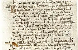 2. ^ Bibliotheque Municipale d'Avranches, Cartulaire du Mont-Saint-Michel (MS 210), folios 83v and 84. Mark S. Hagger, in his 'The Fortunes of a Norman Family: the de Verduns in England, Ireland & Wales' (Four Courts Press, 2001), page 21 & note, gives the date of this charter as 1066, citing Dr Katharine S. B. Keats-Rohan, who provided a transcript to him before publication of her 'The Cartulary of the Abbey of Mont-Saint-Michel' (Published 2009). Despite this, the names of others mentioned in the charter and the dates of their appointments to the offices cited (the Bishop of Avranches and Abbot of Mont-Saint-Michel) indicate that the charter must be dated sometime from 1068 to 1085.