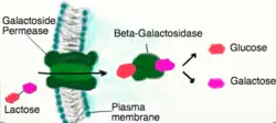 Beta-galactoside permeases can describe any transport proteins that enable a cell to uptake, and thus accumulate, beta-galactosides. One known example of these transport proteins is the melibiose, or melB, carrier protein derived from the melB gene of E. coli.[3] This strain of beta-galactoside permease is known it transport melibiose and other galactosides across the cell membrane using hydrogen, sodium, or lithium ions in cotransport.[4]