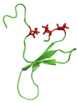 - ^ Blanco, F. J.; Rivas, G.; Serrano, L. (1994). "A short linear peptide that folds into a native stable beta-hairpin in aqueous solution". Nat Struct Biol. 1 (9): 584–590. doi:10.1038/nsb0994-584. PMID 7634098. S2CID 35065527.