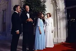 On March 12, 1974, the Fords hosted a state dinner for King Hussein of Jordan after president Nixon, with a week's notice, asked Vice President Ford to take over for him in hosting the already-scheduled state dinner.[25][26] The dinner was held in the John Quincy Adams Drawing Room, one of the Diplomatic Reception Rooms at the United States Department of State headquarters at the Harry S Truman Building.[27]
