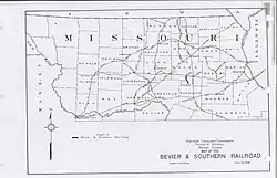 The Bevier and Southern Railroad (reporting mark BVS) was a United States railroad that existed from September 28, 1914, when the Missouri and Louisiana Railroad divided (the Missouri portion of it becoming the BVS), until 1982 when the railroad went out of business and was abandoned.[1][2] The railroad measured 9.18 miles and ran from a connection with the Chicago, Burlington and Quincy Railroad, which was Burlington Northern at the time B&S abandoned in 1982, just west of Bevier, Missouri and ran south to Binkley, Missouri. Primary traffic along the line was outbound coal from coal mines in the area and the railroad's slogan was "Have Train Will Haul."