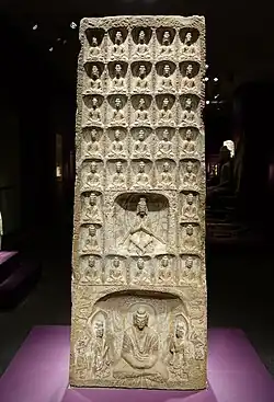 The original Indic text is now lost, though fragments in Gandhari and Sanskrit do survive.[3] One early Chinese translation of the Bhadrakalpikasūtra was done by Dharmarakṣa, a native of Dunhuang, between third and fourth centuries. However this version is incomplete according to Peter Skilling.[3] That the thousand Buddha motif was popular in the Dunhuang region is evidenced by the "Thousand-Buddha Cave", which are world-renowned grottoes at Dunhuang. Various lists of thousand Buddhas have also been found in Khotanese sources, verifying the importance of this narrative theme for the Buddhist Iranian Kingdom of Khotan.[3] Ajanta Cave no. II also includes epigraphic evidence for the idea of the one thousand Buddhas.[3]