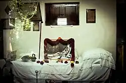 In November 1948, a tiny cancerous lump was found on Ramana Maharshi's arm and was removed in February 1949 by the ashram's doctor. Soon, another growth appeared, and an eminent surgeon performed another operation in March 1949 with radium applied. The doctor told Ramana Maharshi that a complete amputation of the arm to the shoulder was required to save his life, but he refused. Third and fourth operations were performed in August and December 1949, but only weakened him. Other systems of medicine were then tried; all proved fruitless and were stopped by the end of March when devotees gave up all hope. To devotees who begged him to cure himself for the sake of his followers, Ramana Maharshi is said to have replied, "Why are you so attached to this body? Let it go", and "Where can I go? I am here."[11] By April 1950, Ramana Maharshi was too weak to go to the hall and visiting hours were limited. Visitors would file past the small room where he spent his last days to get one final glimpse. He died on 14 April 1950 at 8:47 p.m.[web 9] At the same time a shooting star was seen, which impressed some of his devotees as a synchronicity.[60]